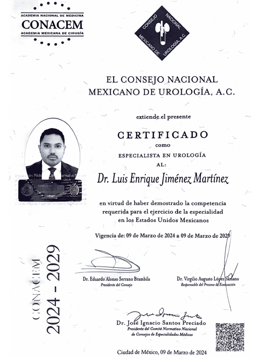 - Certificado por el Consejo Nacional Mexicano de Urología, A.C.