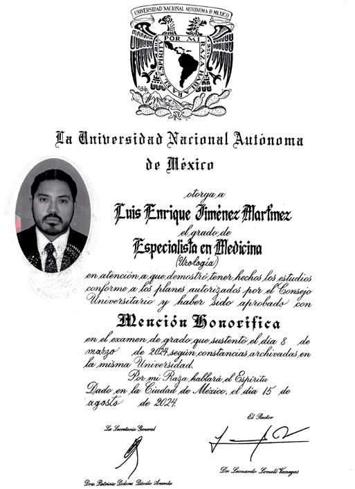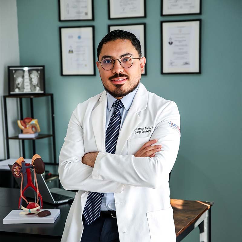 Soy el Dr. Luis Enrique Jiménez Martínez. Tras concluir la licenciatura como Médico Cirujano y Partero, realicé la Especialidad en Urología en el Hospital de Especialidades del Centro Médico Nacional La Raza, donde me gradué con Mención Honorífica. Posteriormente, cursé una Alta Especialidad en Urología Oncológica en el Hospital de Oncología del Centro Médico Nacional Siglo XXI.
