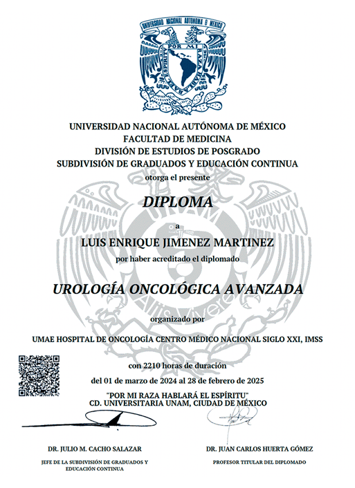 - Alta Especialidad en Urología Oncológica – Hospital de Oncología del Centro Médico Nacional Siglo XXI, avalada por la Universidad Nacional Autónoma de México (UNAM).
